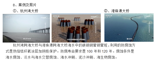 4、壽命長:港珠澳大橋及杭州灣大橋海水中的鋼管樁使用該防腐技術,防腐年限分別是100年和120年。耐海水腐蝕,海水及泥砂沖刷,耐海水與淡水交替腐蝕,耐海洋生物腐蝕,耐打入泥沙時的樁擊。