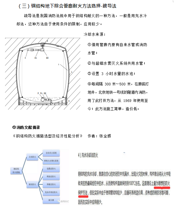 ⑨ 應(yīng)對耐火極限三小時的方式是涂耐火涂料,但耐火涂料壽命只有 10~20 年, 并且不能長期耐潮,在壽命到期失效后重新涂刷時,由于內(nèi)部管線及設(shè)施的存在, 清除殘余失效涂層的工作量大,涂刷新涂層更繁雜,費用較初次施工時大大增加, 并且在管廊整個壽命周期內(nèi)要多次更換防火涂層;更為重要的是,耐火涂料只能阻止火災(zāi)時鋼結(jié)構(gòu)的溫度不高于 550℃,但對于鋼結(jié)構(gòu)地下管廊來說情況特殊,在火災(zāi)發(fā)生半小時左右,耐火涂料覆蓋的鋼結(jié)構(gòu)體溫度就超過 150℃,廊體外部土壤中的水份形成高溫高壓蒸汽,其產(chǎn)生的次生災(zāi)害有可能嚴重于火災(zāi)本身。